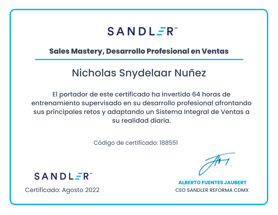 La autoridad de autorizar Centros de Entrenamiento Sandler reside única y exclusivamente en Sandler Systems, Inc. El valor de nuestros certificados y entrenamientos no depende de forma alguna de ninguna otra organización.